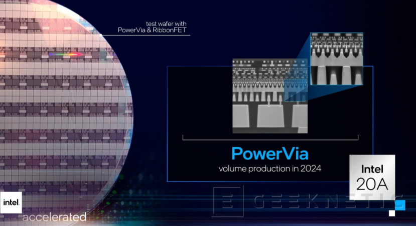 Otra de las mejoras importantes que se introducirán en este proceso de fabricación es la tecnología PowerVia. Se trata en un sistema de entrega de potencia que se realiza por la parte posterior del chip. Esto evita la necesidad de enrutar la energía desde la parte frontal de la oblea. Quitándose de en medio las enrutaciones de potencia, pueden permitirse un enrutado de las señales entre transistores mucho más óptimo, al tiempo que reducen inclinaciones y ruido.
