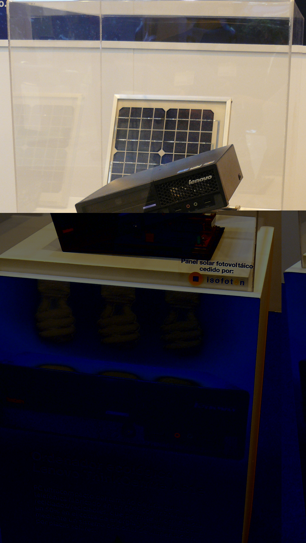 Lenovo también apuesta por la ecología y el ahorro de energía. Nos ha llamado la atención un PC ultra compacto de bajo consumo fabricado con materiales 90% reciclables y capaz de funcionar con una placa solar en lugar de enchufarlo a la red eléctrica general.