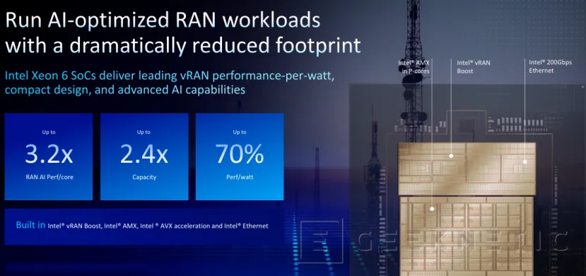 La incorporación de “vRAN Boost” y el soporte Ethernet de estos procesadores, que dependiendo del modelo puede ofrecer soporte de hasta 200GbE, sumado a las instrucciones propias de IA de estos procesadores, como AVX o AMX (de la que ahora hablaremos) permite virtualizar entornos de RAN (Radio Access Network) logrando mediante software, como ya ha ocurrido en otros entornos de red (SD-WAN), lo que antes se requería de varios dispositivos de hardware. Esta tecnología, añadida en algunos SOC Intel Xeon 6, permite reducir de forma notable los costes de propiedad en estos entornos y las nuevas capacidades de estos procesadores también permiten el ahorro de energía.