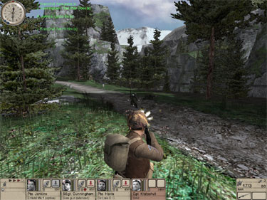 Un poco más adelante llegamos a un desfiladero estrecho por el que pasa la carretera y da a un cruce. Llegado este punto, traeremos a los compañeros que dejamos atrás y los colocaremos al otro lado del camino, entre los árboles, y uno de ellos con el bazooka en las manos, pues por ahí pasara un vehículo blindado cargado de enemigos, que además de ser un objetivo opcional, podría traernos muchos problemas si continuamos solos.