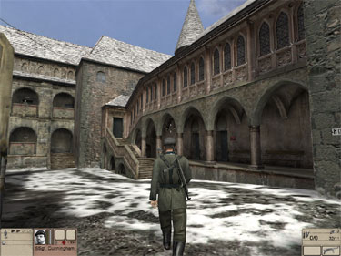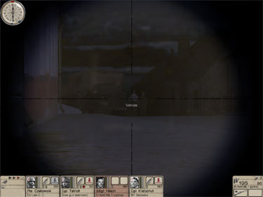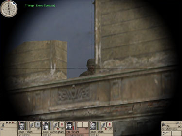 Seleccionamos el soldado que tenga el rifle de mayor alcance y aguardamos a que lleguen los alemanes. Hay que tener mucho cuidado, pues el número de soldados enemigos es elevado. En principio no deberíamos preocuparnos por el cuarto hombre, el situado en la calle por donde pasara el tanque, aun así no estaría mal echar un vistazo si parece que se pone chunga la cosa.