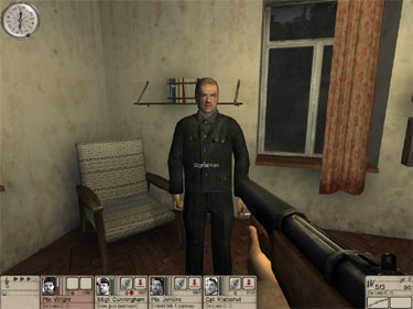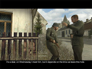 Antes que nada, hablaremos con el miembro de la resistencia que está dentro de la caseta de señales, el primer edificio que se encuentra a la derecha. Él nos dirá que la persona que buscamos aun está en la estación. Intentaremos avanzar lo más sigilosamente posible hasta que tengamos en posición a los cuatro hombres preparados para el tiroteo.