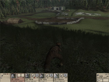 Nada más salir tenemos de frente tres alemanes, que podremos barrer sin problemas con un arma potente, como por ejemplo una BAR. A partir de aquí, si no queremos montar demasiado escándalo, lo mejor es que avancemos personalmente con el que lleve la Sten con silenciador. Encontraremos un poco más adelante un descampado donde unos civiles están cortando leña, escoltados por 3 alemanes.