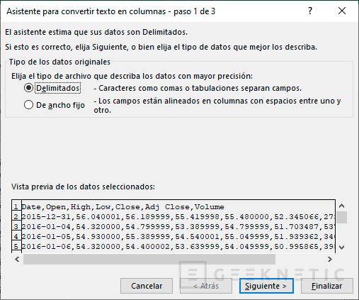 En la siguiente ventana buscamos nuestro archivo y hacemos doble clic. Acto seguido se abrirá una nueva ventana que previsualiza el formato que tendrán los datos según las opciones seleccionadas. Aquí podemos elegir el delimitador CSV o bien seleccionar uno propio. La vista previa se actualiza a cada cambio que hacemos, por lo que es instantáneo. Es importante notar que, a pesar de que nuestros valores tenían decimales en forma de punto, aquí no se muestran así, no pasa nada porque lo arreglaremos más adelante con un simple clic.