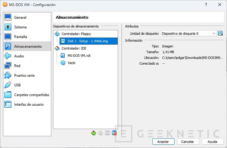 6. Con la máquina virtual creada, entra en las opciones y presiona en Almacenamiento. En el apartado Floppy selecciona la imagen Disk 1 - Setup. Hacerlo es el equivalente a introducir el primer disquete de instalación de MS-DOS. Haz clic en Aceptar para terminar.