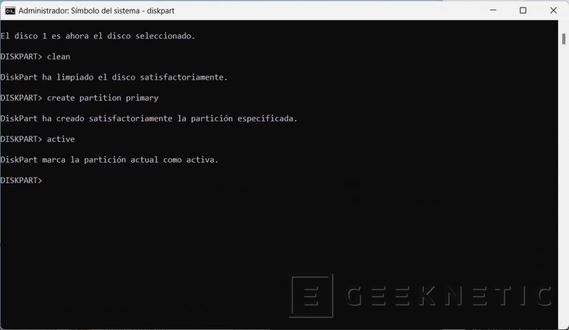Esto lo que va a hacer es limpiar el USB para que quede listo de cara a formatearlo y a dotarlo de un sistema de archivos. Recibirás un mensaje de confirmación diciendo que DiskPart ha limpiado el disco satisfactoriamente.