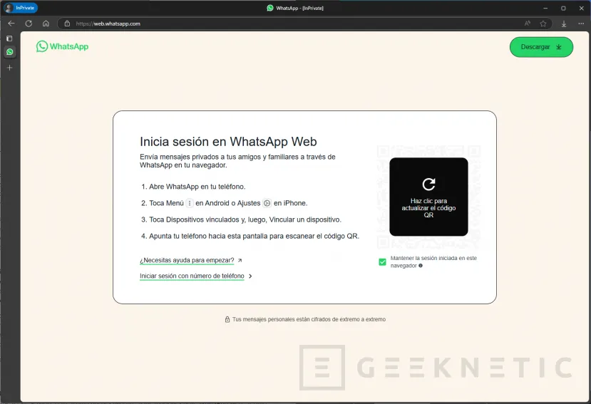 - Seguidamente, deja que cargue la página y espera a que aparezca el código QR. Este código debes escanearlo desde tu móvil. Sigue las instrucciones que aparecen en pantalla. Si no te aclaras, también puedes hacer clic en el enlace Iniciar sesión con número de teléfono. Esta última opción genera un código que te permite vincular el dispositivo. Es útil si tienes problemas con la cámara de tu dispositivo.