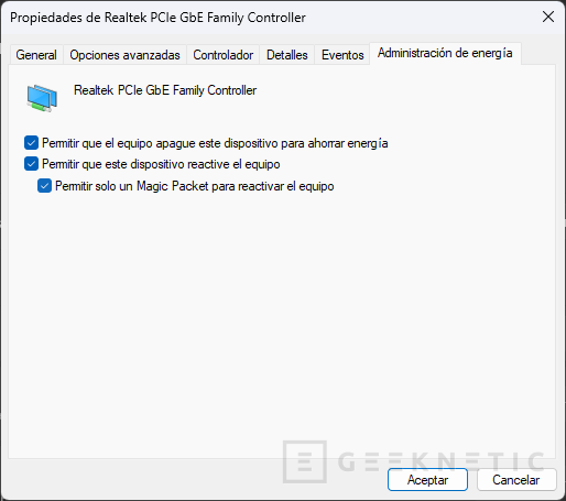 - Debemos tener marcadas las opciones Permitir que este dispositivo reactive el equipo, y también Permitir solo un Magic Packet para reactivar el equipo. Con esta última opción reducimos la posibilidad de que el equipo se active de forma involuntaria por otro tráfico en la red.