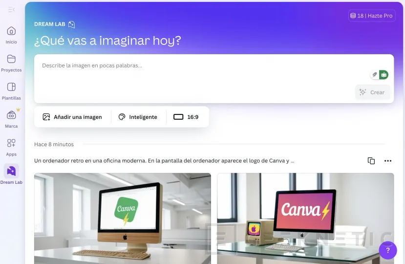 Hace tiempo que Canva apuesta por la IA. Una de las integraciones es la Escritura mágica, que permite generar texto en cualquier proyecto. Ahora bien, creo que Dream Lab es la implementación más interesante. Básicamente, emplea modelos de difusión para generar imágenes a partir de texto. También permite subir imágenes para usarlas como referencia visual.