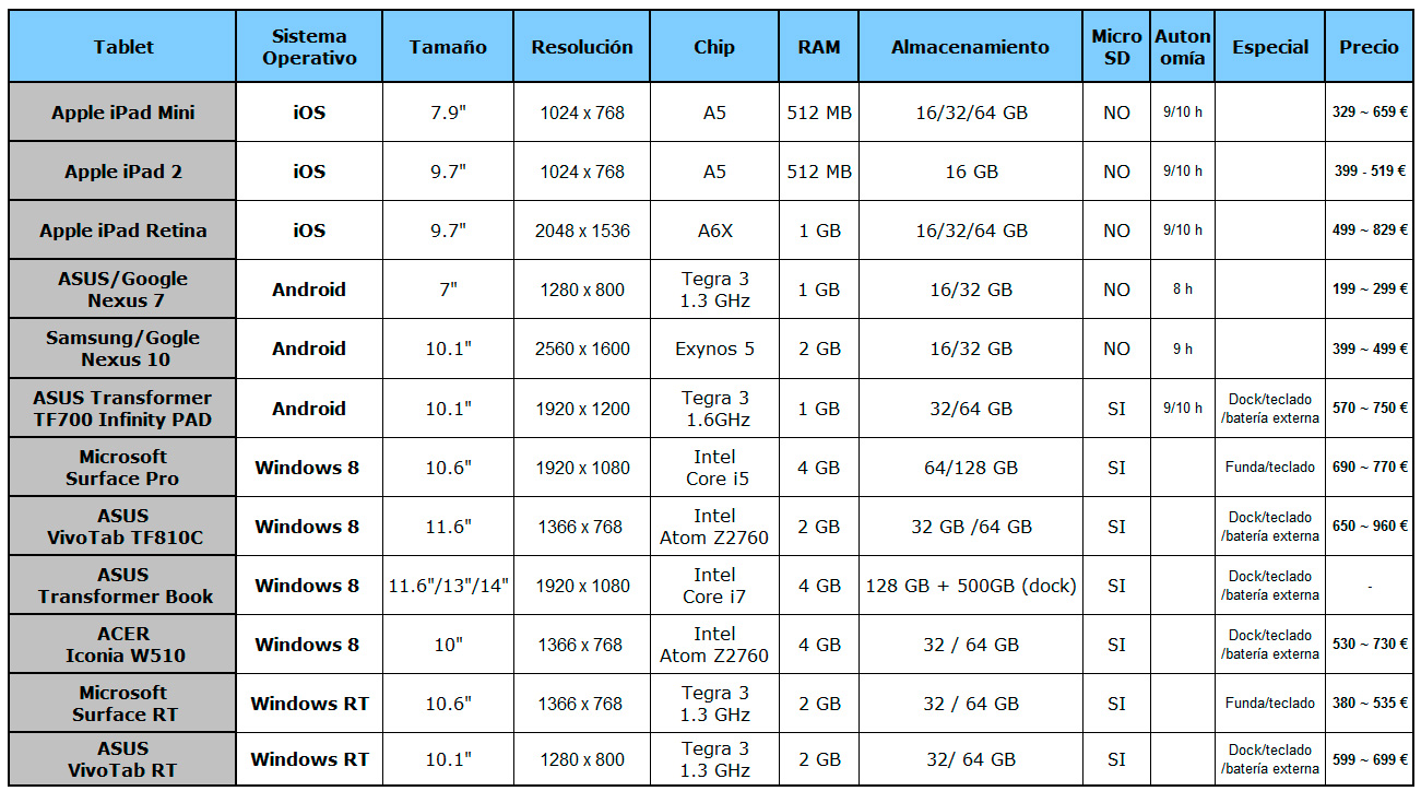 Finalmente podemos ver en la siguiente tablet los detalles más importantes de los tablets comentados para poder ver todos los datos más importantes en su conjunto. (click para ampliar).