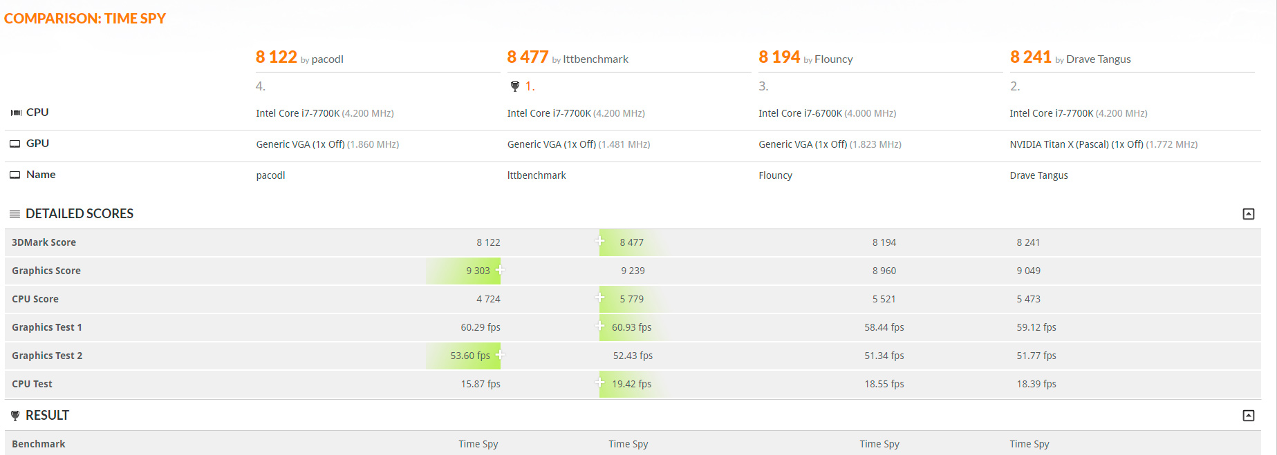 Se trata de resultados en el test Time Spy, el último añadido a la suite 3DMark y que se caracteriza por hacer uso de la API gráfica DirectX 12. Los resultados hablan de una puntuación de 9239 puntos con unas frecuencias de 1.481 MHz. Más que los 9049 puntos que ofrece la TITAN X Pascal con OC.