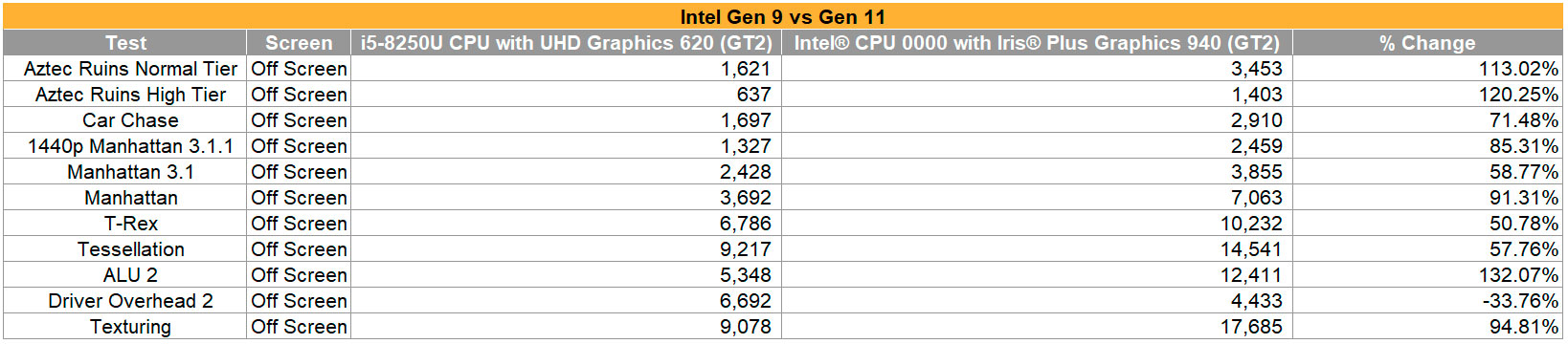 Parece que Intel lo va a dar todo en esta arquitectura y los procesadores estrenarán un potente diseño de iGPU que pondrá en aprietos a las Vega de AMD. Según la última filtración de rendimiento, las GPU Intel Gen 11 darán, ena numerosas ocasiones, un 100% más de rendimiento que las actuales. La filtración se basa en benchmarcks y juegos actuales, aunque desconocemos la configuración de los mismos. Además, comparando esta misteriosa iGPU con las Vega RX 10 y 11 de AMD, a la versión 10 le supera en todo, mientras que equipara a la Vega 11 en muchas ocasiones.