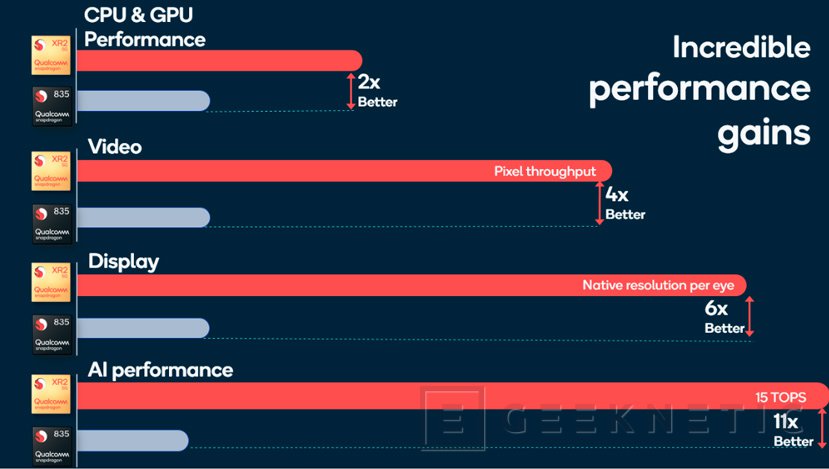 Entrando a lo que ofrecerá en términos de rendimiento, Qualcomm asegura el la plataforma XR2 conseguirá duplicar el desempeño en GPu y CPU del Snapdragon 835, un SoC que vendría a equivaler al XR1.