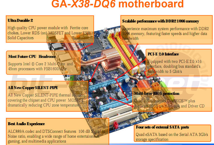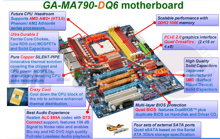 La placa en si sigue la serie de DQ6 de Gigabyte con heatpipes por todas partes, alto nivel de calidad en su integración y diversidad de opciones tanto en conectividad de periféricos como de comunicaciones. Sera sin duda una de las placas a tener en cuenta por los entusiastas que tengan pensado en adaptar su sistema a los procesadores Phenom que se presentaran alla por el mes de noviembre.