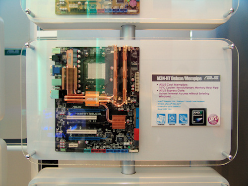 Esta nueva placa base de Asus, la M3N-HT es la nueva gama alta de Asus para procesadores AMD. Esta placa dispone de PCI Express 2.0, soporte para Triple SLI, soporte para todos los últimos procesadores de AMD, DDR2-1066 y un complejo sistema de Heatpipes que alcanzan incluso a los módulos de memoria, aunque extrañamente solo a dos de los bancos.
