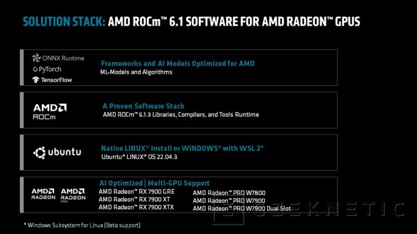 Esta nueva versión de AMD ROCm 6.1.3 llega con algunas novedades interesantes, ahora es compatible con configuraciones de múltiples GPUs, que permitirá la creación de soluciones para múltiples servicios gracias a la escalabilidad. También en nivel beta se ofrece soporte para el subsistema Windows en Linux, concretamente con WSL 2, que permitirá ejecutar las herramientas de IA de Linux en un sistema Windows. También se hace compatible con TensorFlow, añadiendo otra opción a las ya existentes PyTorch y ONNX.