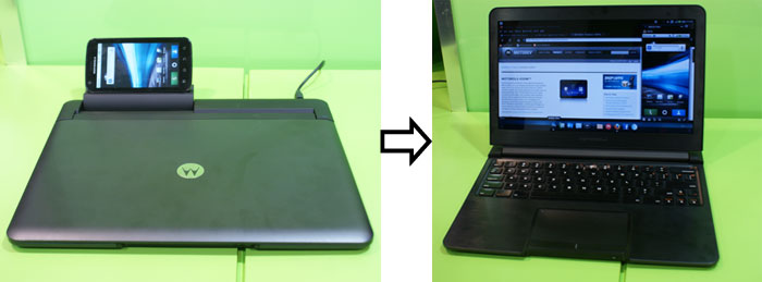 El otro docking llamado Lapdock es muy similar. Se trata de la estructura de un portátil (teclado + pantalla de 11,6 pulgadas + altavoces estéreo) con el docking incorporado en la parte posterior. Las funciones son exactamente las mismas que las del HD Multimedia para usarlo como desktop. Además el Lapdock dispone de batería propia, por lo que en un apuro puede darnos 6 horas más de vida a nuestro móvil ya que ambos dockings alimentan y cargan el Motorola ATRIX 4G.