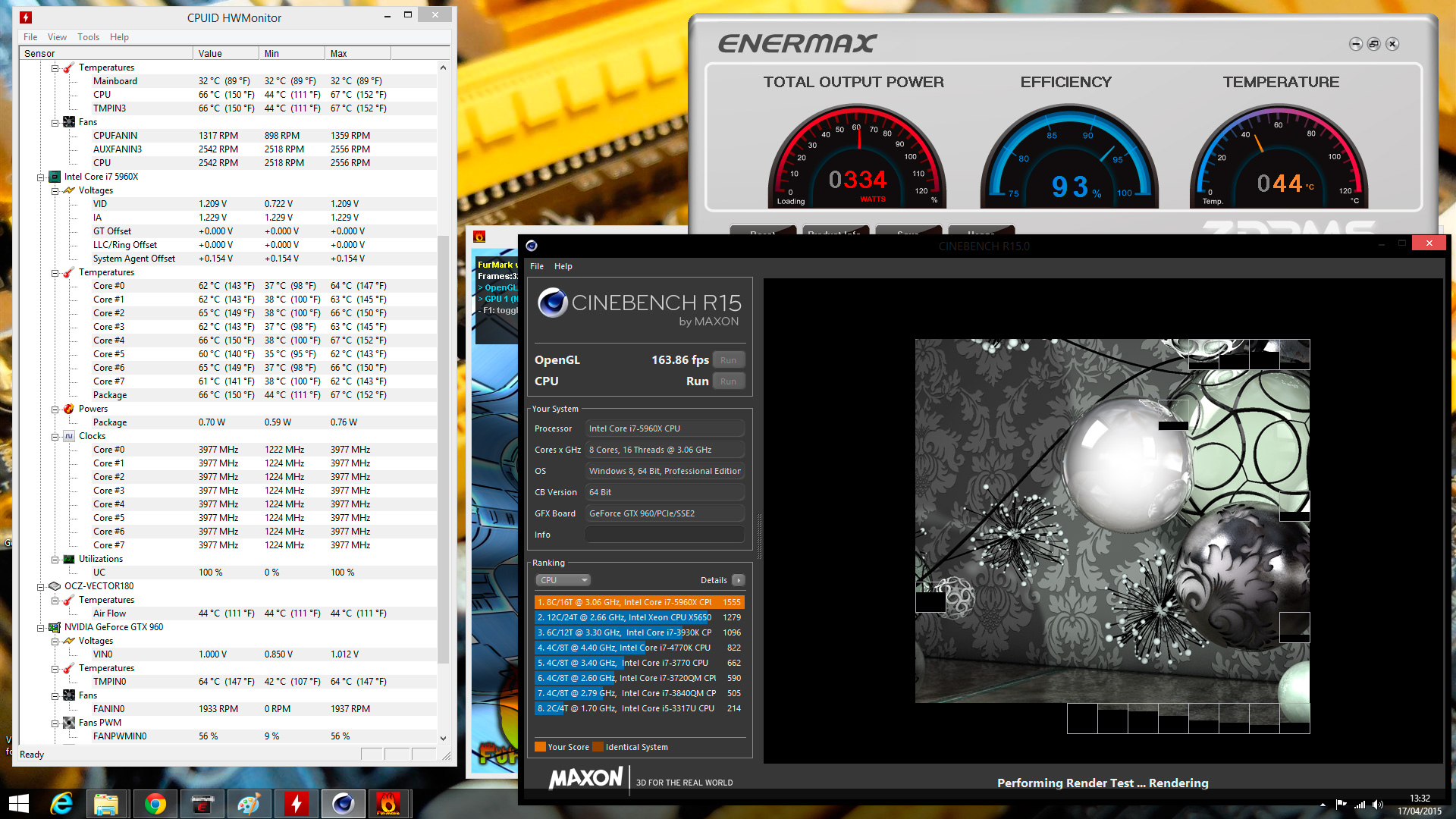 Nosotros cargamos esta fuente con el peso de un Core i7-5960X a 4GHz, con voltaje automático, y una GeForce GTX 960. El resultado como veis es un consumo de 334w en carga con 93% de eficiencia y una temperatura más que razonable de funcionamiento de 44 grados a una temperatura ambiente de 22 grados. Esta fuente bien podría con este procesador, una gráfica más potente o dos de estas y un buen número de discos duros y estaríamos perfectamente dentro de sus parámetros de funcionamiento.