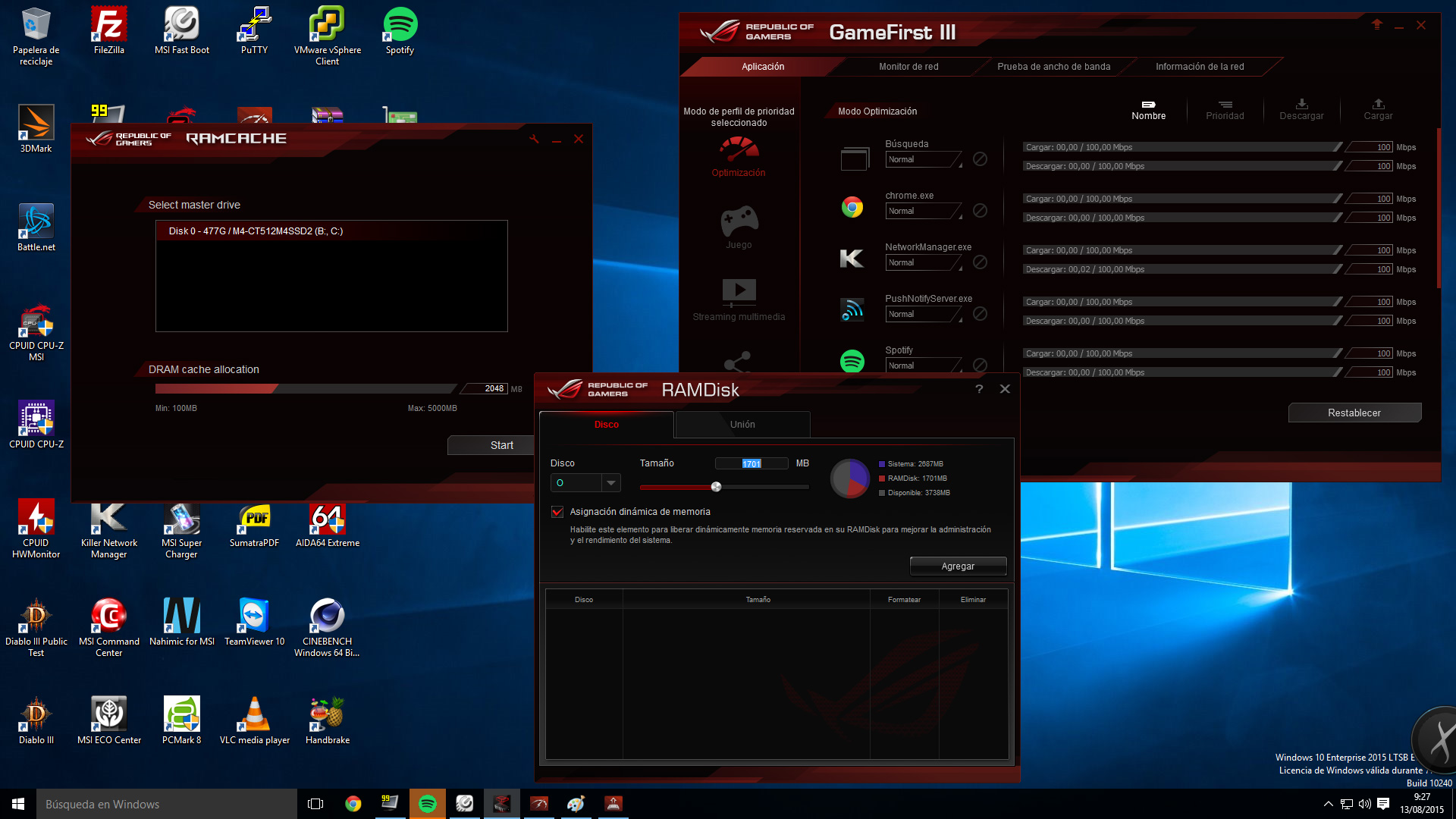 El software incluido con la placa es también completo y variado. En esta gama ASUS echa el resto y podemos encontrar funciones avanzadas como su software de priorización de paquetes, la segunda edición del sistema de programabilidad de teclados clásicos Keybot, su sistema de RAMDisk para generar unidades de almacenamiento sobre RAM (con persistencia al reiniciar o apagar) o también novedades como el CacheRAM que nos permite usar la RAM a modo de cache de sistema de almacenamiento. Igual que usamos memoria SSD para acelerar el proceso de discos mecánicos pero orientado a acelerar, más si cabe, el proceso de datos en discos SSD mediante el uso de la memoria RAM del sistema.