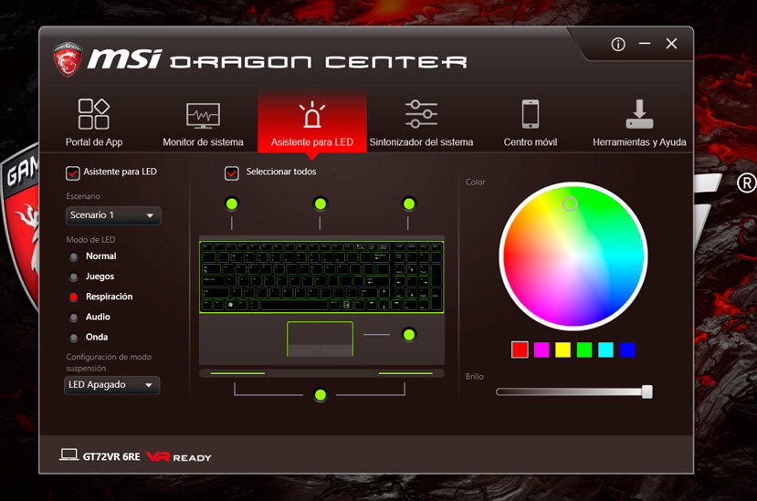 Incluye un sistema de iluminación RGB con distintos efectos configurables, ya sea nivel global o por varias zonas diferenciadas entre las que también se incluye el borde del trackpad y dos tiras LED que se encuentra en el frontal del equipo.
