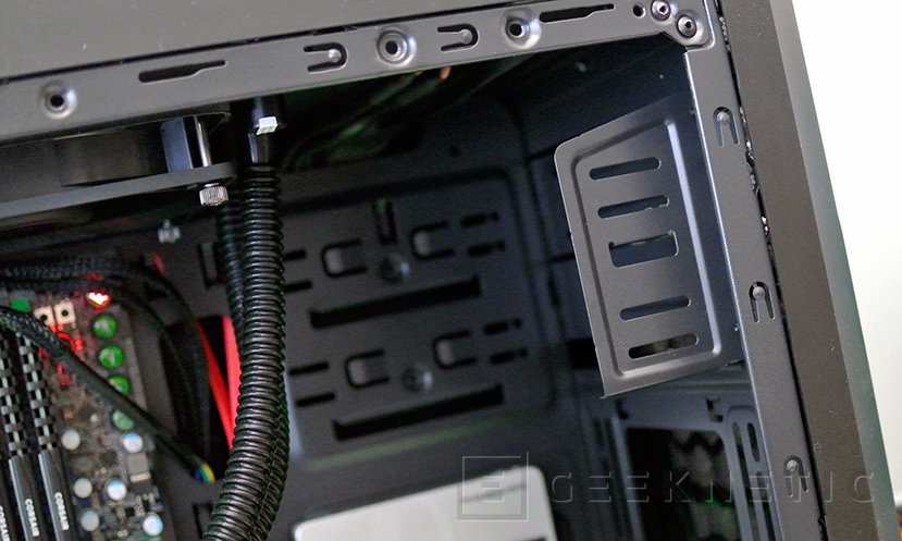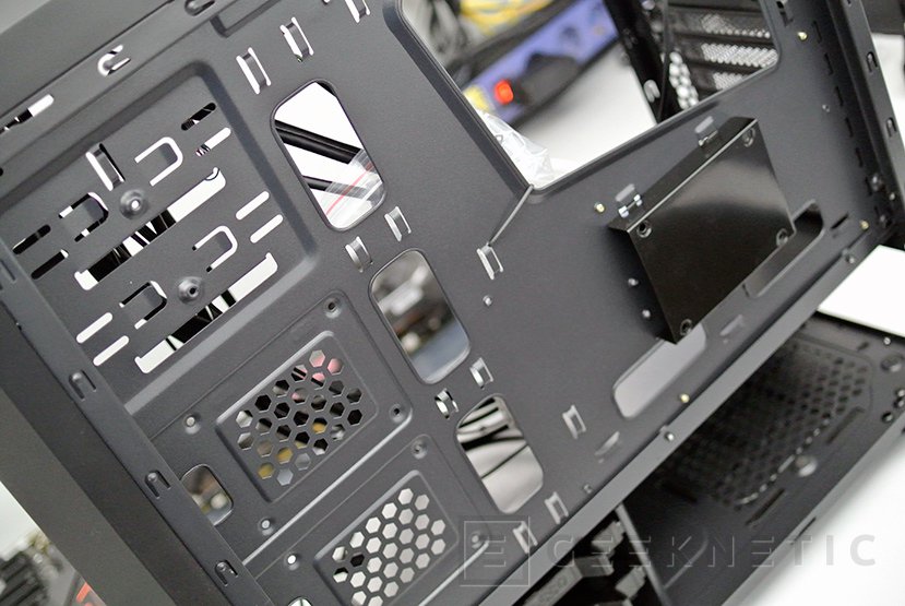 La fabricación de los compartimentos de la caja está realizada con la propia chapa que hace de soporte interno para la placa base. Todo de una pieza, pero no completamente continuada hasta el frente de la caja. Esto lo ha hecho Nox porque este modelo tiene bahías de 5.25”, con un diseño muy inteligente, y ese corte permite que bajemos un kit de radiador de 240mm hasta abajo y así podemos montar refrigeración líquida frontal y mantener las unidades de almacenamiento de 5.25”.