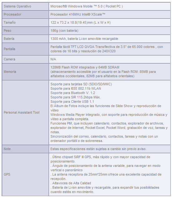 La nueva A636 es una maquina moderna que incorpora el ultimo sistema operativo y los últimos avances. Procesador Intel Xcale a 416MHz, 128MB de memoria ROM y 64MB de memoria RAM son sus principales datos técnicos. La pantalla es la habitual en el mundo del PC, 3.5" TFT con una profundidad de color de 65.000 colores simultáneos, la resolución de la misma es QVGA o lo que es lo mismo, 320x240 píxeles. La ampliación de memoria corre a cargo de un slot SD, que trae consigo un adaptador a miniSD y su peso no llega a los 190gr con la batería. Batería que por cierto tiene una potencia de 1300mAh. Quizás no son datos espectaculares pero donde la A636 tiene todo su potencial es en su capacidad de comunicación.