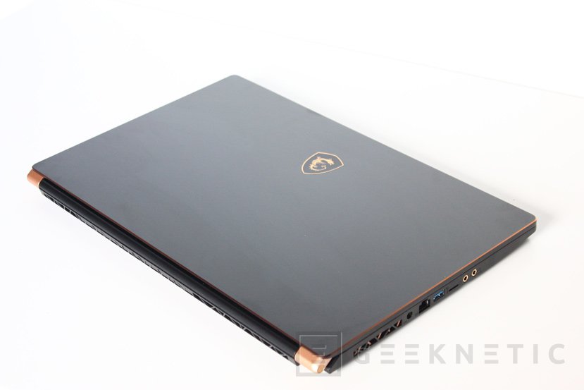 El esquema de color es el negro metalizado con toques dorados que encontraremos tanto en los bordes de la carcasa de la pantalla como en el logo del dragón de MSI Gaming y en las bisagras. Este diseño consigue un toque muy elegante y profesional, pero, al mismo tiempo, no esconde que se trata de un equipo centrado en juegos.