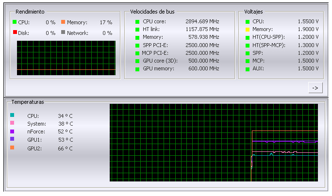 Overclocking con la Foxconn Las funciones de esta placa para realizar overclocking son excelentes. Encontramos todo lo necesario para optimizar el overclocking a nuestro hardware. También, como hemos visto, podemos hacer uso del panel nTune de nVidia para cualquier ajuste pero desde la propia bios encontraremos todo lo que podamos desear para hacer de nuestro procesador todo lo que queramos. Es destacable también el soporte de la placa para los errores, ella misma detecta los errores de configuración y a los pocos segundos arranca con su configuración por defecto. Así podemos corregir errores sin perder apenas unos segundos. Nuestra experiencia con el AM2 3500+ es bastante satisfactoria, con un voltaje medio de 1.55v y el disipador de serie conseguimos una frecuencia interesante de 2900MHz con un multiplicador de 10x y un bus frontal de 290MHz. Teniendo en cuenta que el disipador es el que viene de serie con el procesador nos encontramos con dos resultados interesantes, por un lado, los AM2 overclockean de maravilla y se calientan verdaderamente poco y por otro, esta placa base hace que overclockear sea un juego de niños. El disponer de memoria DDR2, ya sea 667 como la nuestra, facilita mucho estas tareas sobretodo si queremos usar frecuencias sincronas y tambien, si no tenemos mucho conocimiento de lo que hacemos.