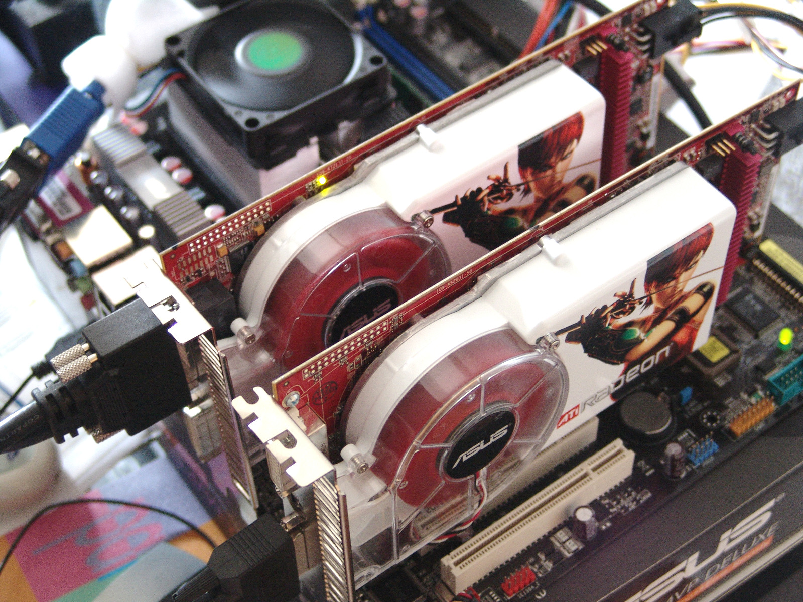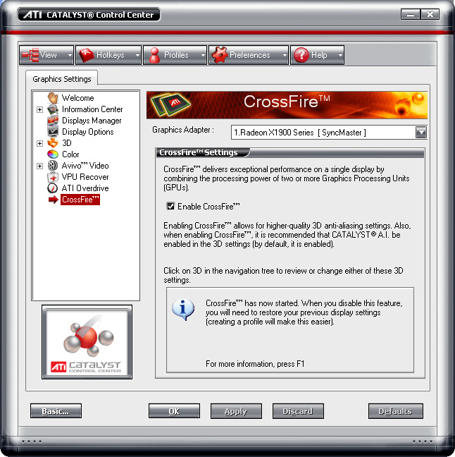 Introducción Un sistema de gama alta de motores gráficos significa en la actualidad montar cuantos mas chips graficos de gama alta podamos encontrar. En el caso de nVidia podemos montar hasta cuatro pero su eficiencia esta aun por demostrar. En el caso de ATI lo máximo que podemos encontrar es lo que nosotros hemos podido probar estos días. Y esta que leéis es la crónica de nuestras experiencias. Plataforma ATI, ASUS, AMD. ¿Será esto algo parecido a lo que AMD y ATI prometen ofrecer después de su "fusión"?. En nuestra maquina de pruebas se da la coincidencia de que usamos un chipset ATI con un procesador AMD y todo integrado por Asus, rey indiscutible de la integración de placas y tarjetas graficas. Esto será como un aperitivo de lo que podremos esperar del desarrollo conjunto de AMD y ATI para los próximos años. ATI, por lo menos hasta ahora, solo ha licenciado la tecnología Crossfire a chipsets de Intel y claro esta, a los suyos propios. Asi que para montar un Crossfire de ATI con procesadores AMD lo mejor es usar un chipset ATI, aunque hay ciertas soluciones de terceros como ULI pero que parece que nVidia se ha decidido a cortar por lo sano. Para un correcto funcionamiento de las dos tarjetas graficas es importante que la placa base pueda funcionar a 16x en ambos puertos PCI Express gráficos aunque tampoco es fundamental para su correcto funcionar. Si hay un chipset interesante para el Crossfire este es sin duda el Xpress 3200 de ATI. Entre otras cosas permite montar dos graficas en Crossfire sin necesidad de una tarjeta maestra (luego explicaremos esto un poco mas) por lo que la inversión en el sistema Crossfire puede ser mucho mas económico, ya que las gráficas maestras, son siempre de gama alta y con este chipset podemos montar tarjetas de gama media en paralelo.