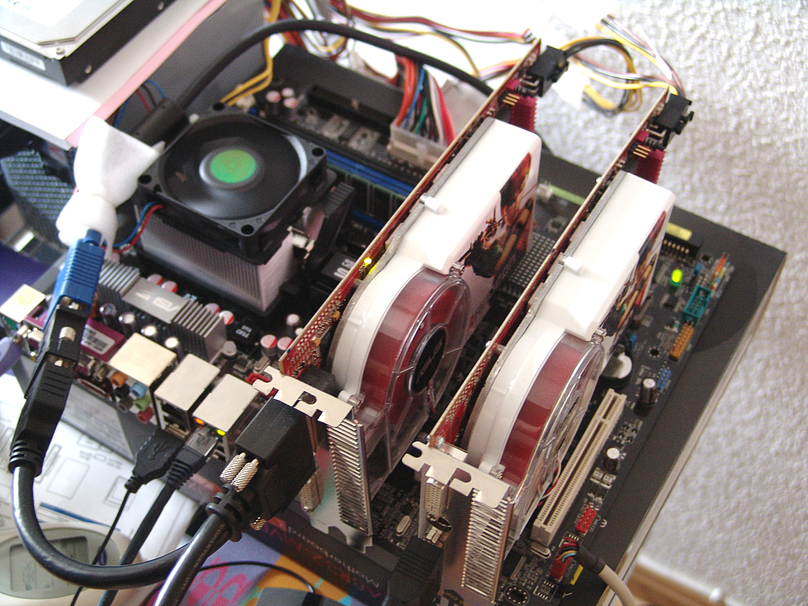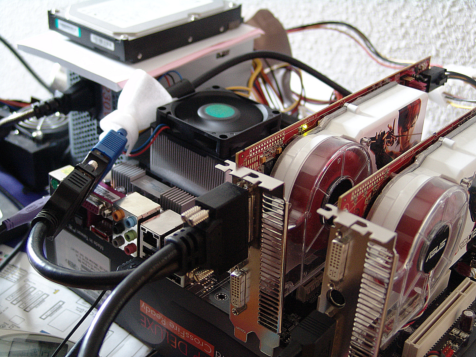 Montando el CrossFire. Dos tarjetas de grandes dimensiones, un apetito voraz por los 12v de tu fuente de alimentación y un mucho calor que disipar. Eso es básicamente lo que conseguimos con este tipo de sistemas. En cuanto al rendimiento luego lo veremos pero para empezar necesitaremos una fuente de alimentación con al menos 600W y dos raíles independientes de 12v. Una caja muy ventilada, y unos buenos tapones para los oídos, también serian interesantes si queremos hacer trabajar a estas dos tarjetas en paralelo. Se calientan mucho, sobretodo cuando jugamos y su método de expulsión por turbina, encima duplicado, es realmente alto. Para montar un sistema de esto tenemos que tener en cuenta que requerimos de un procesador de alto rendimiento, para suministrar las grandes cantidades de información que estas maquinas son capaces de procesar para mostrar en pantalla.