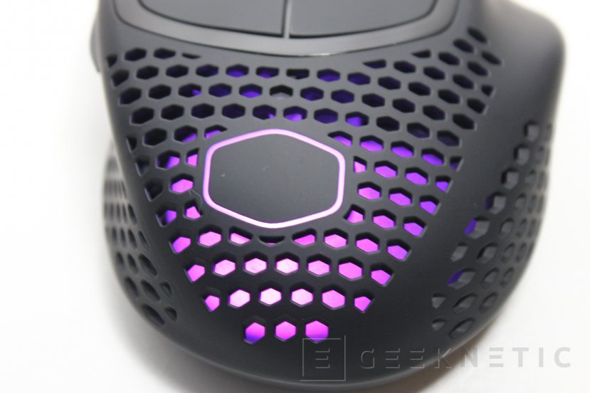 Más allá de la reducción de peso que se consigue con los agujeros, Cooler Master ha conseguido dotarlos también de un sentido estético al integrar en su interior una amplia pieza semitransparente bajo la que van colocados los LEDs RGB, difuminando la luz y dejando ver, a través de los agujeros y de la silueta del logo de Cooler Master, los distintos colores y efectos que soporta el ratón y que se pueden cambiar desde el software MasterPlus+ o directamente desde el ratón combinando el botón central de la rueda con otros botones.
