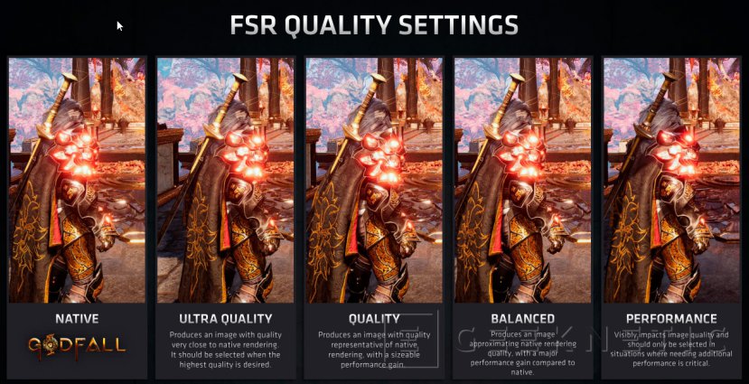 La tecnología FSR nos permite acceder a diferentes niveles de ajuste de sobre escalado, como veremos después, y se implementa a nivel de unidades de sombreado, no a mediante aprendizaje como el DLSS, por lo que no requiere de drivers específicos y también es compatible con chips Nvidia, algunos de los cuales no soportan la tecnología DLSS 2.0 de Nvidia al no disponer de unidades de inteligencia artificial.