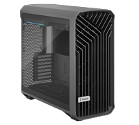 Ambos laterales de la Torrent están cubiertos por dos grandes paneles de cristal templado con un ligero toque oscurecido en esta versión. Se integran en una carcasa del mismo color que el frontal, gris en este caso concreto, y con el logo de fractal en una chapa plateada situada en la parte frontal inferior.
