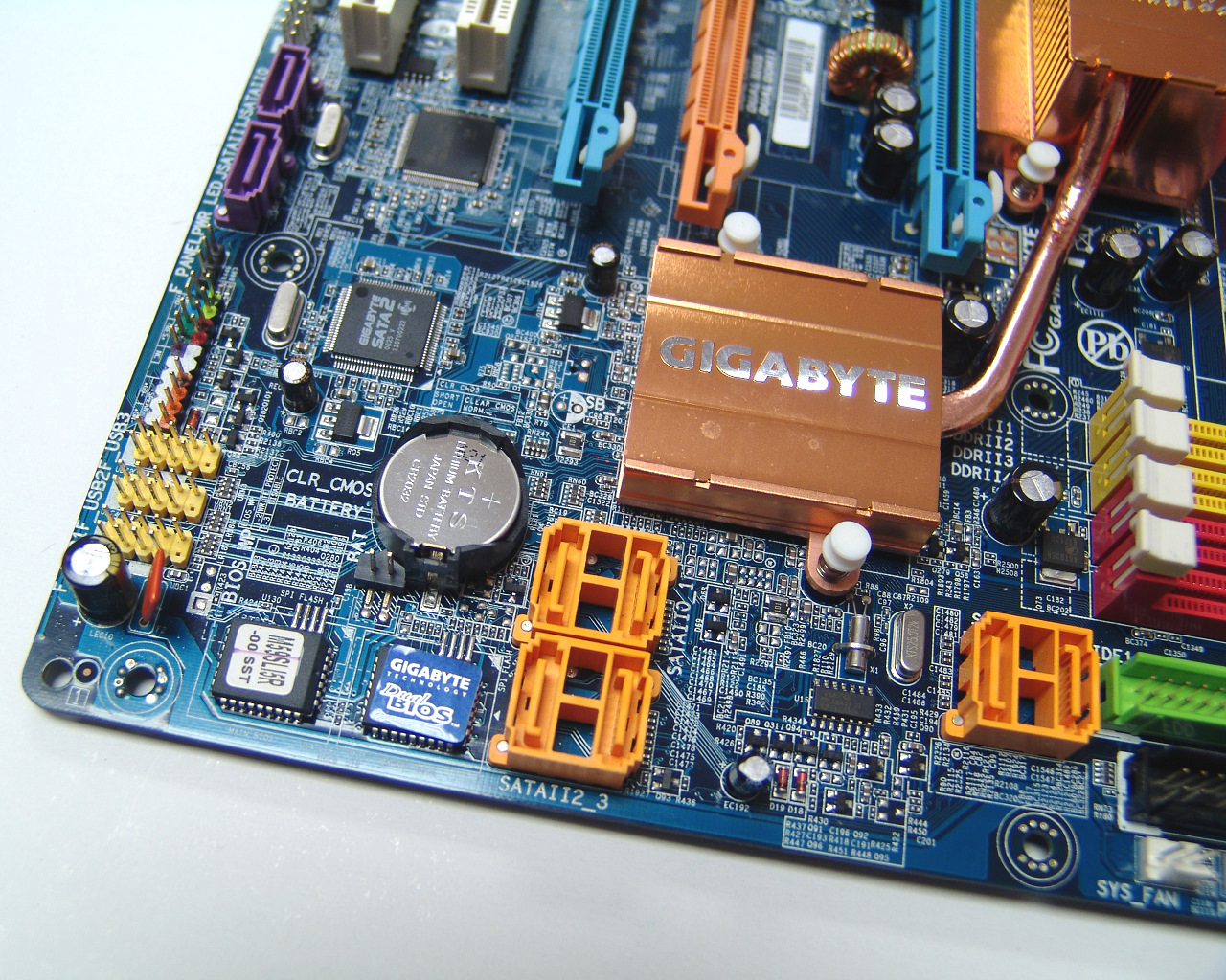 Desde esta perspectiva podemos apreciar el sistema de dual bios de la placa, que protege de errores de actualización con una copia de salvaguarda, y los otros cuatro conectores Serial ATA principales. Arriba a la izquierda, en color morado, encontramos los dos añadidos de la controladora ITE IT8716 que añade Gigabyte para aumentar la capacidad de conectividad y que están especialmente pensados para los conectores Serial ATA Externos que trae la placa en un bracket añadido. Como puede funcionar también en modo IDE no tendremos problemas en usarla para cargar sistemas operativos ni nada por el estilo. Hacen un total de ocho conectores Serial ATA 2 con capacidad RAID en ambas controladoras, mas no se puede pedir. Dentro de la imagen vemos también las conexiones internas USB 2.0 en forma de conjuntos de 9 pines de base dorada. Podemos usarlos como queramos y nos ofrecen un total de 10 conexiones USB 2.0 en toda la placa. Su posición es ideal además para frontales de caja o conexión de periféricos internos como pantallas LCDs, lectores de tarjetas, etc. Encontraremos también dos posiciones de conectores Firewire A de 400mbits que complementan al Firewire Mini trasero dando un total de 3 posibles conectores Firewire. Su controladora no puede ser de mejor calidad ya que lo firma la mismísima Texas Instruments.