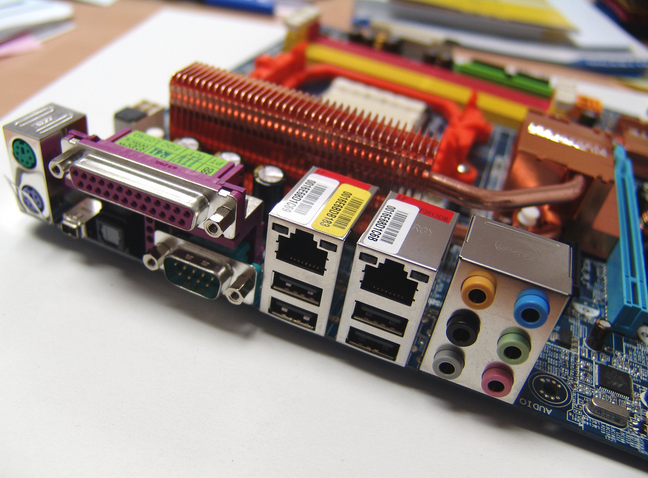 El diseño del panel de conexiones traseras es muy tradicional pero completo. Como vemos disponemos de una tarjeta de sonido HD Audio propulsada por un DSP AD1888 HD Audio con 8 canales analógicos, salidas frontales independientes y salidas de audio digital en forma de SPDIF óptico en este mismo panel trasero. Soporta  tecnologías de codificación tipo "theater" en tiempo real como Dolby Digital Live y DTS Connect.  Encontraremos también dos tarjetas de Red, una de ellas conectada al chipset y otra mediante PCI Express y con un chip Marvell 88E1116. Ambos son Gigabit y se montan sobre los cuatro conectores USB 2.0 que completan las diez unidades sumadas a los 6 delanteros de los que ya hemos hablado. Tendremos también soporte de conectores de legado como puerto Serie, Puerto Paralelo y dos puertos PS2 para teclado y ratón. Curiosamente se ha optado por un Firewire Mini  de cuatro contactos para darle cabida en este abarrotado panel trasero de conectores.