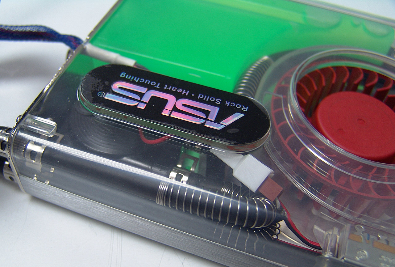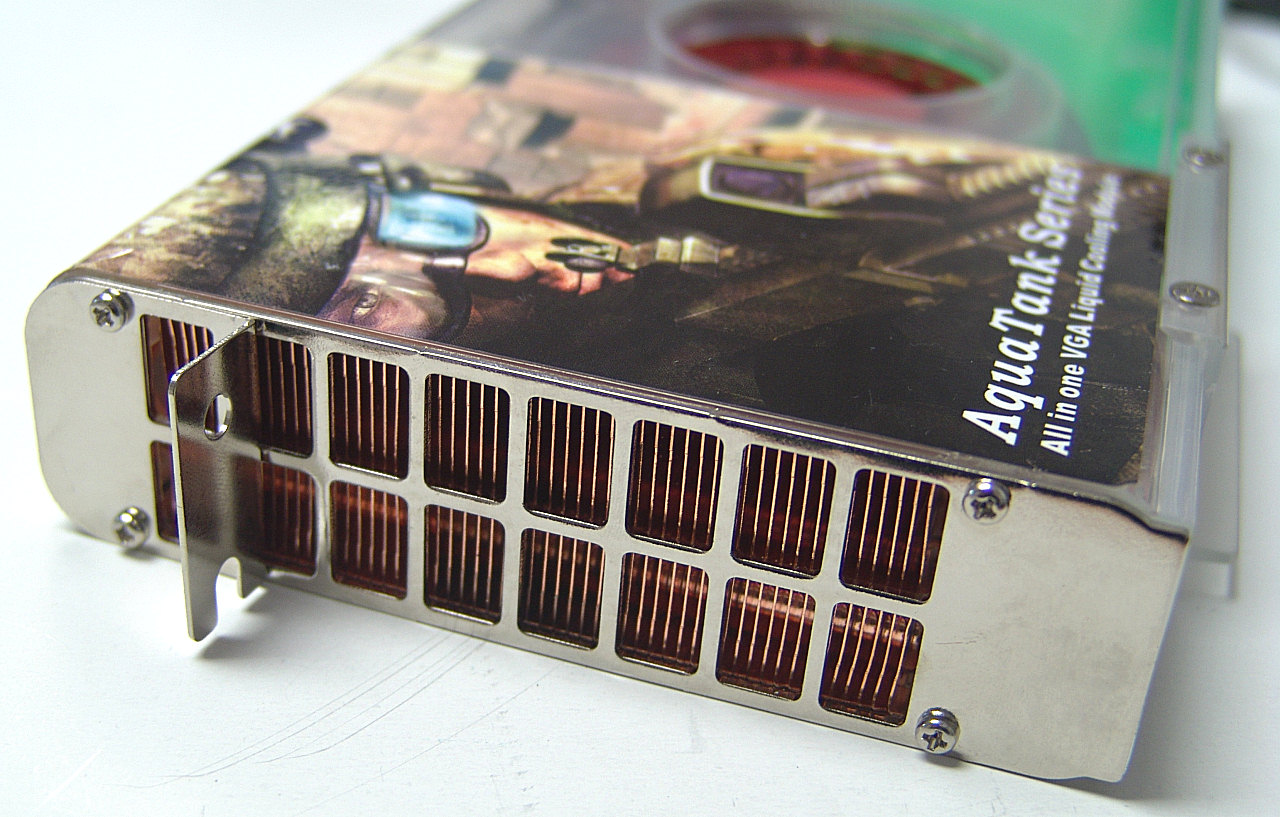 Esto que veis en la imagen es el modulo de refrigeración Aquatank. Dentro de este bloque encontraremos todo lo que encontramos habitualmente en cualquier sistema de refrigeración por agua. Tenemos una microbomba que funciona a 12v, un deposito de refrigerante (por supuesto viene ya cargado de fabrica) una turbina de refrigeración y el radiador de cobre donde se disipa el calor transportado desde la GPU de la tarjeta.
