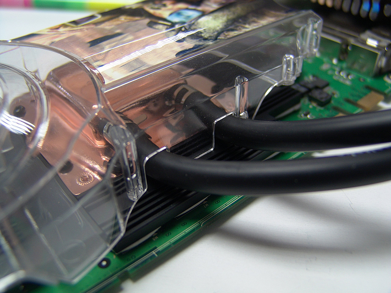 Los tubos usados por el sistema son de 8mm de exterior y 6mm de interior. No son ni espectaculares ni especialmente grandes pero si muy flexibles y hacen su trabajo a la perfección. El bloque de intercambio de calor está totalmente construido en cobre, el igual que el radiador como hemos visto, lo cual evita problemas de corrosión por intercambio de electrones entre diferentes materiales. Es un sistema que nos durara toda la vida de la tarjeta.