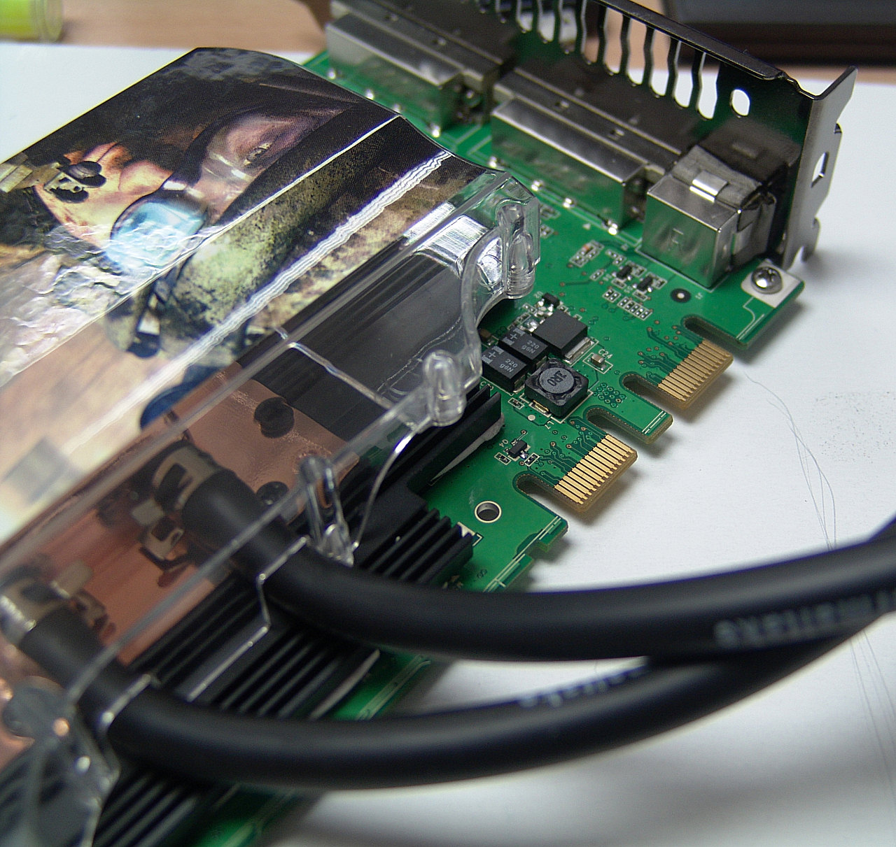 Para mi esta es la tarjeta comercial más bella que he tenido la oportunidad de probar. Desde aquí podemos ver detalles de la entrada de los tubos, los conectores SLI, doble en el caso de las 8800GTX y la salida de aire frontal en el segundo slot que ocupa. Por ahora hemos visto que la 8800GTX Aquatank de Asus es una tarjeta muy bella y con unos números por encima de la media, ha llegado el momento de que la pongamos a prueba, de que conozcamos si aun puede subir mas su rendimiento mediante overclocking y de que la comparemos con algunas otras tarjetas de gama media y alta.