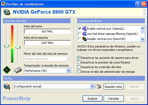 PowerStrip es a día de hoy la utilidad más cómoda para hacer overclocking de tarjetas 8800 de Nvidia en Windows XP y Windows Vista. Es de las pocas que no da ningún problema y su manejo es muy simple. Además otra cosa que me gusta de él es que no mide la velocidad de las memorias en velocidades DDR, así tenemos un control más real de la velocidad de nuestras memorias. Nuestra máquina de pruebas. Una tarjeta grafica de este nivel se merece un procesador a la altura. Vamos a testear su potencia con nuestra mesa de pruebas asistida por una Vapochill que tiene actualmente el record de rendimiento de PMCore. Un procesador de cuatro núcleos a una frecuencia de 4.2GHz, 2GB de memoria DDR2, todo montado sobre una impresionante Bad Axe 2 de Intel. Un procesador Core 2 Quad a 4.2GHz producirá unos niveles de información que nos permitirán sacar el máximo rendimiento a esta 8800GTX Aquatank de Asus. Una grafica con este nivel de prestaciones y de números teóricos necesita de un procesador muy overclockeado si queremos aprovechar cada Euro invertido en ella. Si no haces overclocking a tu procesador no compres esta tarjeta grafica porque la estarás desaprovechando. Vamos a demostrar el rendimiento de la 8800GTX Aquatank en dos tandas de pruebas, primero veremos qué mejora de rendimiento nos ofrece el overclocking de esta tarjeta comparada con sigo mismo, después usaremos los resultados de artículos anteriores para que veamos en que niveles estratosféricos se mueve la potencia de esta tarjeta. Todos los resultados están tomados con la misma máquina.