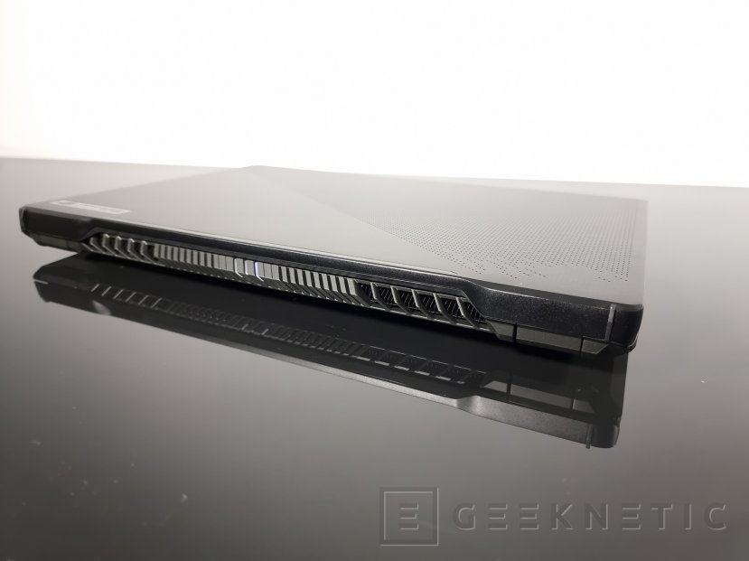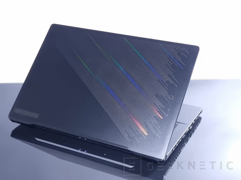 La carcasa de la pantalla deja ver una mitad, con pequeñas microperforaciones. En este modelo no tenemos pantalla de microLEDs para personalizar como en el G14 más reciente que hemos analizado, pero sí que se crea un efecto iridiscente que va cambiando de color dependiendo desde donde le de la luz. Exactamente igual que en su predecesor.