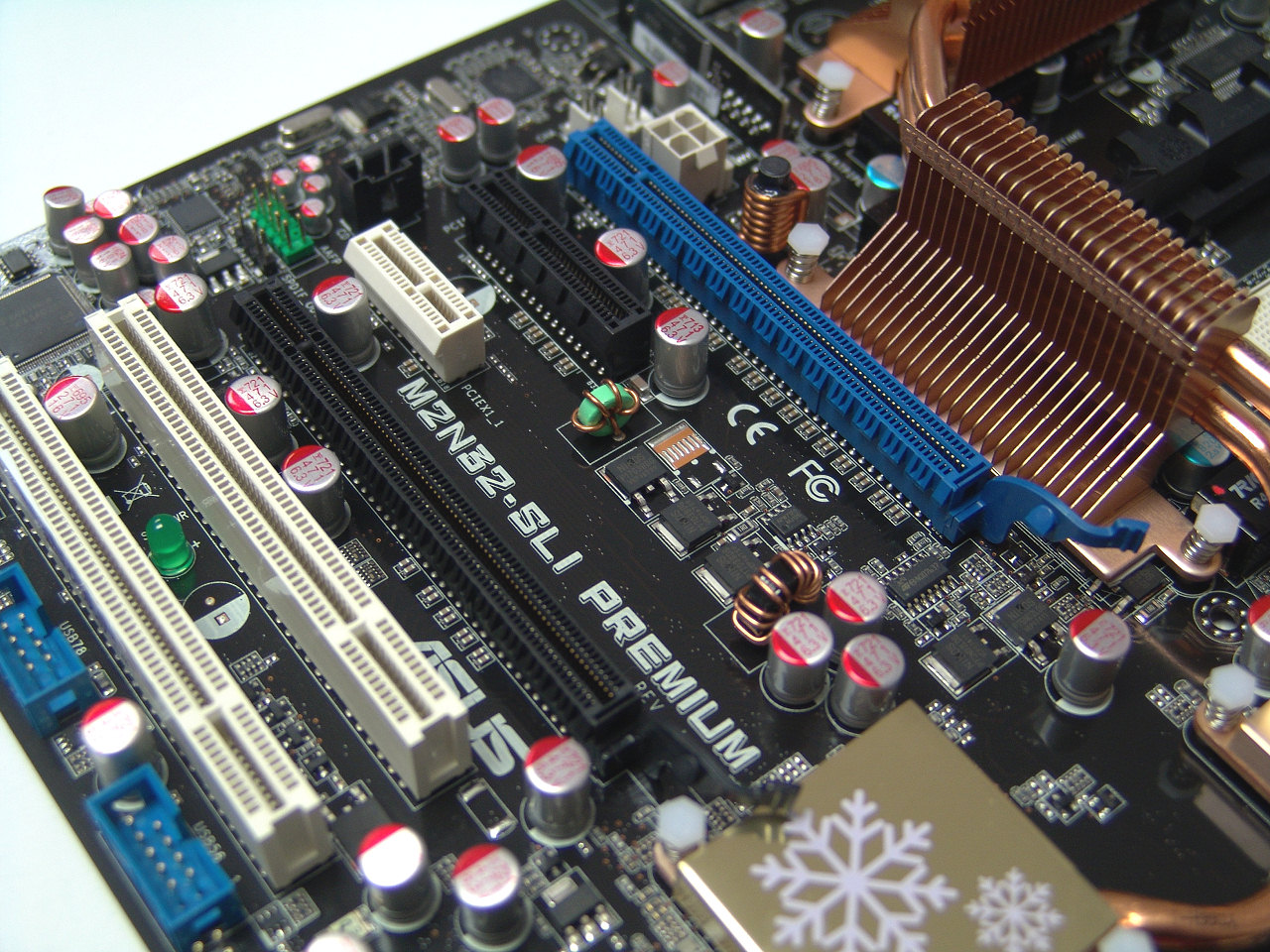 Conociendo la M2N32-SLI Premium Vista Edition. Socket AM2 con zócalos de memoria encima del procesador. Esta es para mi la mejor distribución que podemos obtener en cuanto a procesadores AMD se refiere. Deja más espacio para disipadores y nos sitúa los componentes de una forma más manejable. Esta placa soporta 8GB de memoria DDR2 y su chipset, como también se aprecia en la siguiente imagen, esta refrigerado por un conjunto de heatpipes. Lo cierto es que la placa se calienta bastante y estos disipadores grandes y su posición rodeando al procesador. De este modo el aire despedido del disipador del procesador será aprovechado también por el sistema pasivo del chipset, con un solo ventilador logramos disipar todos los componentes de la placa.