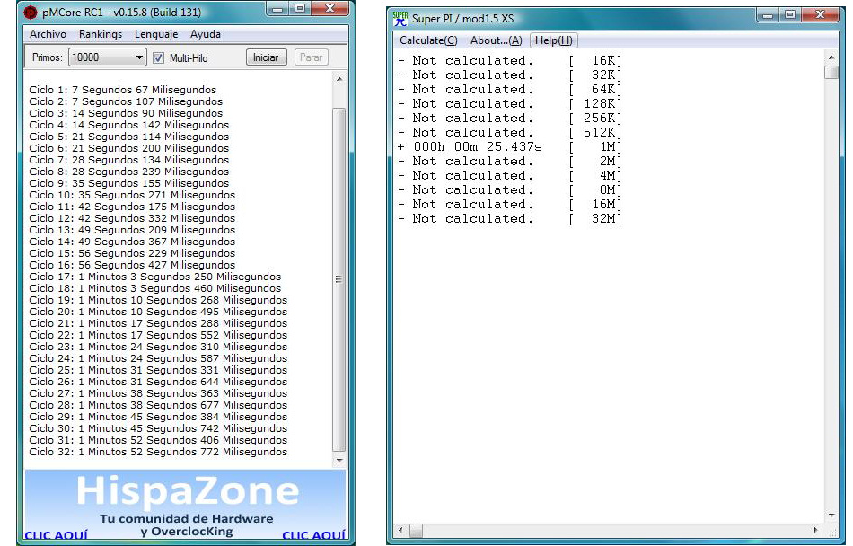 SuperPI y PMCore. Nuestras dos pruebas cortas preferidas, una orientada al cálculo de decimales del número Pi y el otro al cálculo de números Primos. Dos aplicaciones cortas y de rápida ejecución con la diferencia que PMCore dispone de una base de datos online automática y soporte para procesadores multinúcleo como son casi todos actualmente. Hemos realizado la prueba multinúcleo de 10.000 números primos en PMCore y la de 1M de SuperPI.