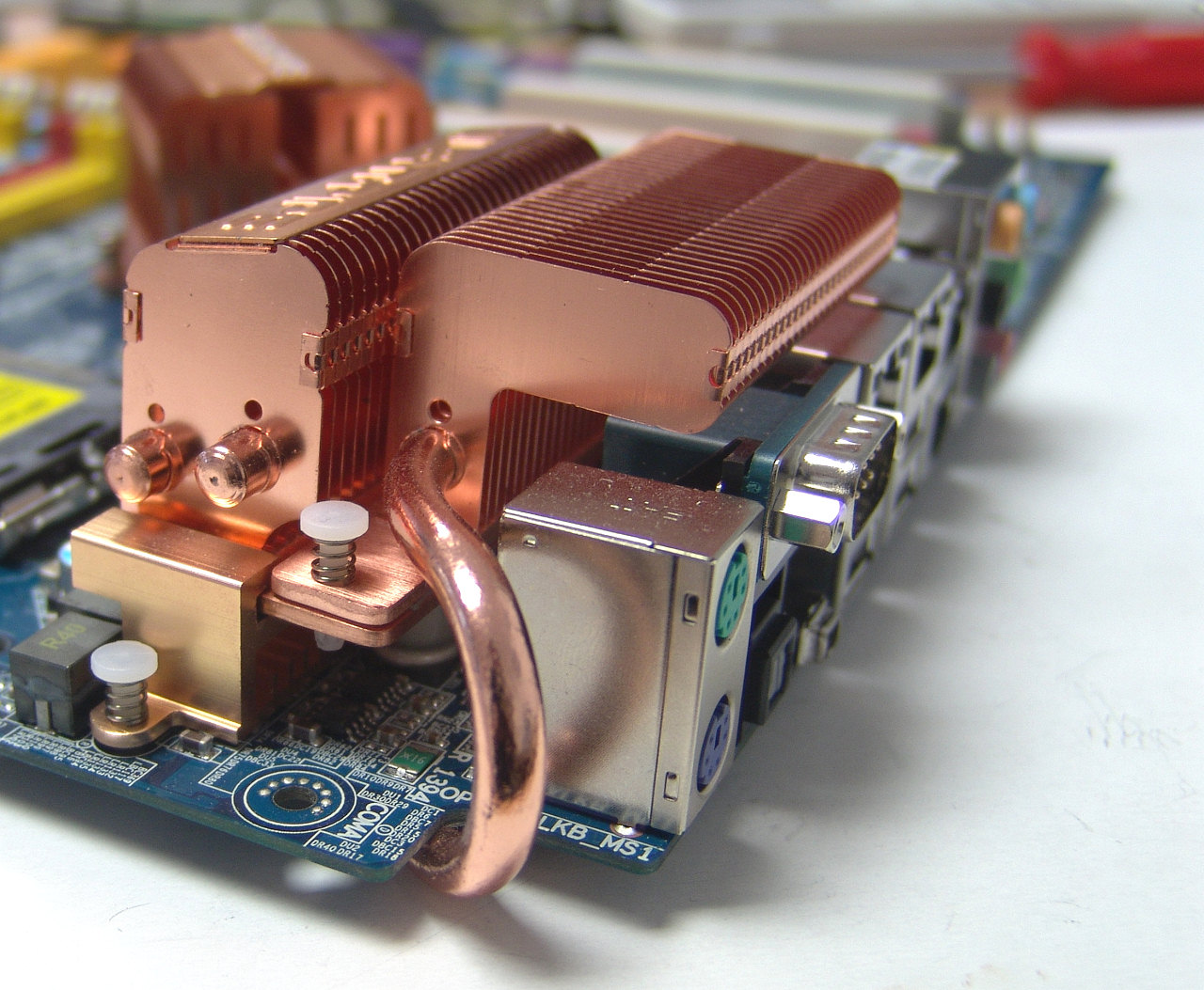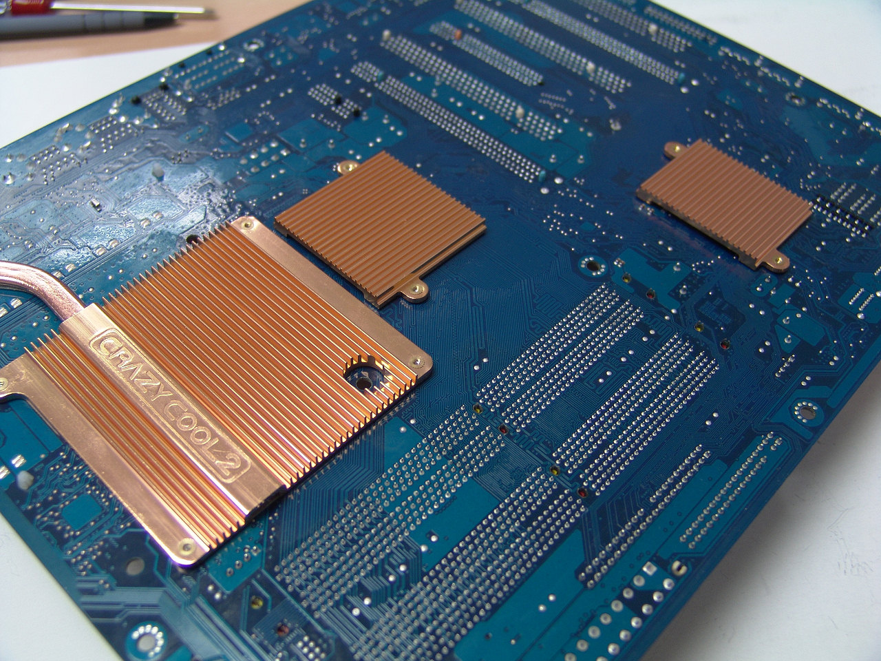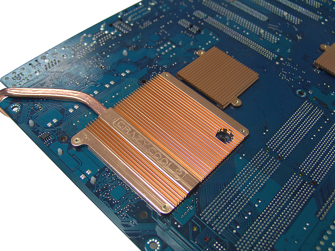 Esta captura detallada nos muestra los tres disipadores de que dispone esta placa en su parte posterior. El cobre resalta sobre el fondo azul, color de PCB habitual en todas las placas de Gigabyte. Gigabyte ha recortado una esquina de la placa base para poder meter por ahí la heatpipe que veis aparecer por la parte izquierda de la imagen. La verdad es que si queremos desmontar este sistema no lo vamos a tener nada fácil, de hecho si no tenemos cuidado y usamos las herramientas adecuadas podemos tener bastante problemas para retirar todo este sistema.