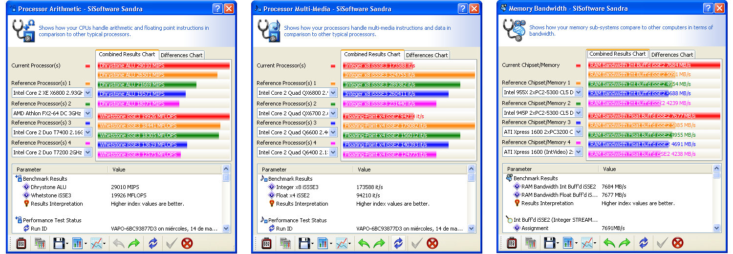 Pruebas de rendimiento general. Por último añadiré algunas pruebas de rendimiento general donde podáis comprobar lo bien que rinde este procesador, en esta placa base, a la frecuencia de overclocking que hemos establecido. No son records ni mucho menos pero si son unos resultados muy interesantes para un procesador de gama bastante baja que se convierte en un procesador muy competente para lograr magníficos resultados y aprovechar nuestra inversión en una placa base de gama alta. La Máquina de pruebas. El ordenador completo que hemos usado para nuestras pruebas dispone de las siguientes piezas: - Procesador: Core 2 Duo E6320 1.86Ghz 4MB de Intel. - Placa base: Gigabyte GA-N680SLI-DQ6. - Memoria: 2GB OCZ HPC Reaper DDR2 PC8500. - Tarjeta gráfica: XFX 8800GTS 320MB. - Disco Duro: Seagate 7200.10 250GB SATA. - Disipador: Zalman CNPS8000.
