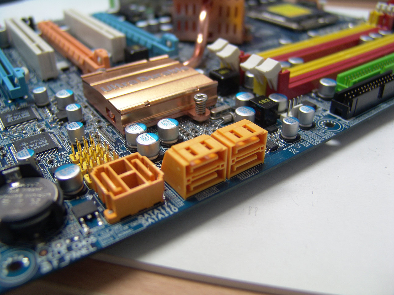 Donde Gigabyte también ha echado el resto es en el sistema de disipación de la placa base. A mí personalmente las heatpipe me parecen un estorbo más que una ventaja pero supongo que muchos de vosotros lo veréis de un modo totalmente diferente al mío. El sistema de la 680SLI-DQ6 es el más masivo que he visto en una placa base. No solo cubre toda la zona anterior donde encontramos los dos chipsets y los mosfets sino que también se dirige a la parte posterior de la placa base, concretamente a la zona posterior del procesador. En esta parte de la placa base encontraremos otros disipadores de cobre destinados al procesador, al puente norte de la placa base e incluso uno para el puente sur de la placa. Algo impresionante para muchos pero que a otros nos obliga a buscar soluciones dedicadas a cada cosa si queremos, por ejemplo, refrigerar nuestro puente norte con un bloque de agua. El sistema de disipación se expande sobre los conectores traseros de la placa base. La verdad es que es la placa base más pesada que hemos tenido en las manos. Es masiva y espectacular, que es algo que buscamos muchos para dar más vida y vistosidad a nuestro ordenador. La distribución de la placa es también muy buena, me gusta mucho la combinación de puertos Sata convencionales como los colocados en 90º que dan mucha comodidad para la instalación y ocultación de los cables Serial ATA.