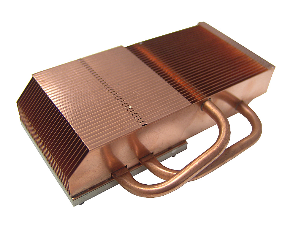 Este es básicamente el disipador de la 2900XT. Esta totalmente construido en cobre y usa un sistema de heatpipes, bastante gruesas, para enviar el calor de forma rápida a lo largo de todas las finas laminas de cobre que lo componen. AMD ha optado por una solución completamente en cobre lo que le hace más pesada que tarjetas de gama similar como las 8800GTS que usan sobretodo aluminio con solo algunas zonas de cobre como la base de contacto. La turbina que se ve en la imagen expulsa el aire caliente fuera de la caja del ordenador con lo que la saturación de calor interno es mínima.