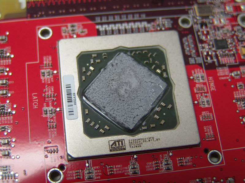 Es curiosa la posición invertida del "die" del procesador del R600. No hemos retirado la pasta ya que ahora la serigrafía, indicando los datos del procesador, se graba con láser en la base de protección del procesador. Esta fabricado mediante un proceso de 80nm y aun así su tamaño es considerable. 700 millones de transistores tienen la culpa de su tamaño, de su consumo y de sus prestaciones también.