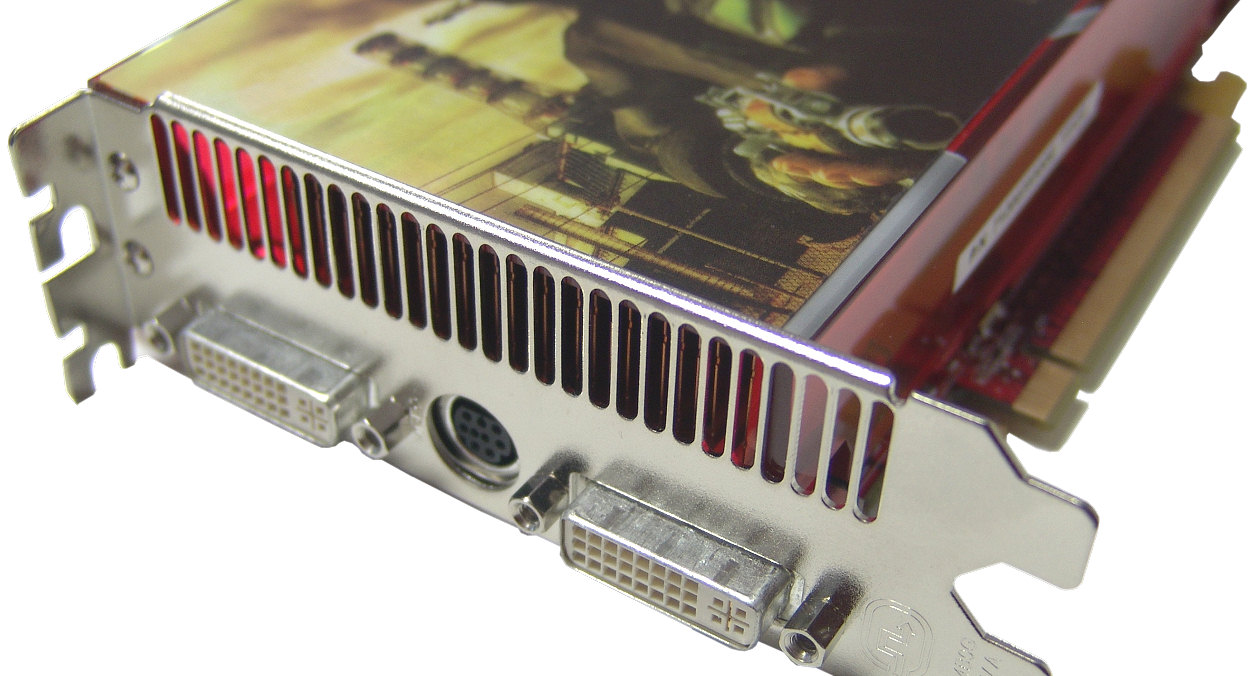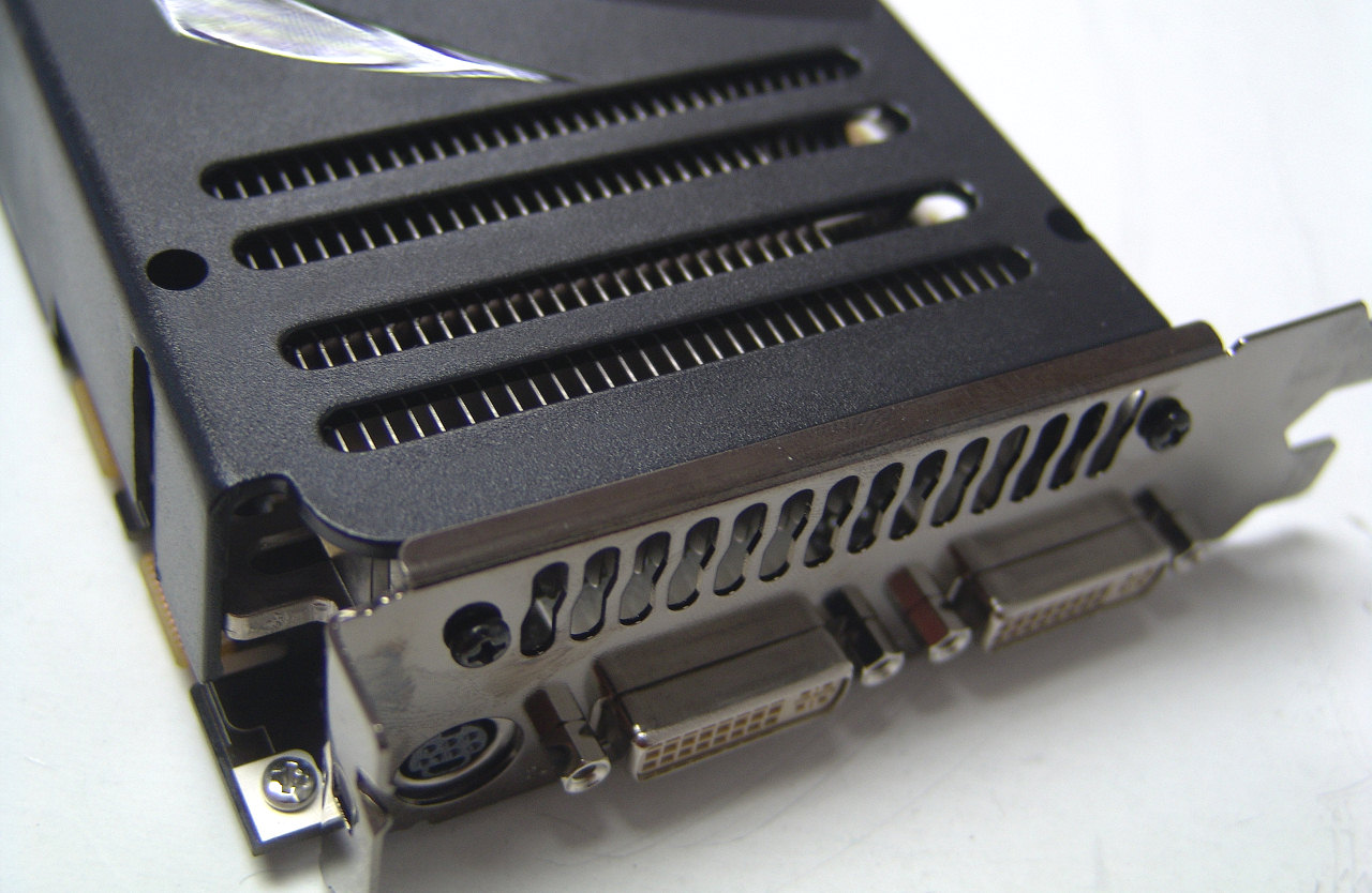 El frontal de estas tarjetas no ha cambiado. Seguimos teniendo el par de DVI del tipo I que podemos convertir a VGA y la salida de TV tipo Svideo que podemos usar también por componentes. Ahora también le sumamos el adaptador HDMI a DVI que nos sacara tanto video como audio digital de la tarjeta. La rejilla superior sirve para extraer el aire caliente de la tarjeta.