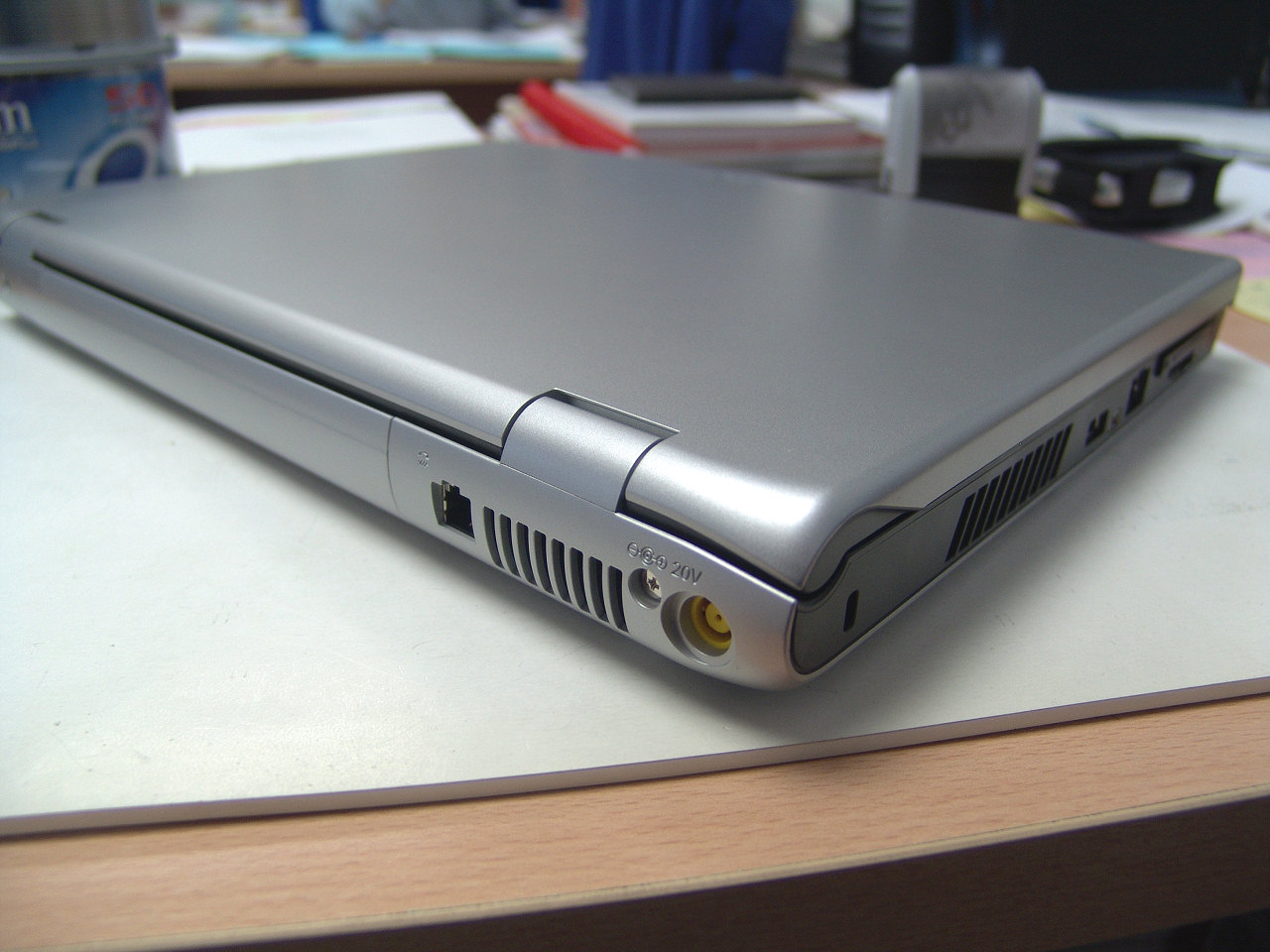 El aspecto externo del aparato es muy atractivo, mucho más juvenil que cualquier modelo de IBM antes de la era Lenovo. En la parte posterior solo encontraremos la toma de modem analógico y la conexión del adaptador de corriente. Adaptador que es bastante manejable lo que facilita su desplazamiento. En la zona posterior izquierda, donde andamos situados en la imagen, podemos ver que también tenemos la escapatoria de calor del portátil. Básicamente se ocupa del procesador y monta un ventilador autorregulado por la bios así que el funcionamiento general del aparato es realmente silencioso y tampoco tiene rápidas escaladas de velocidad en el ventilador que suelen ser muy molestas.