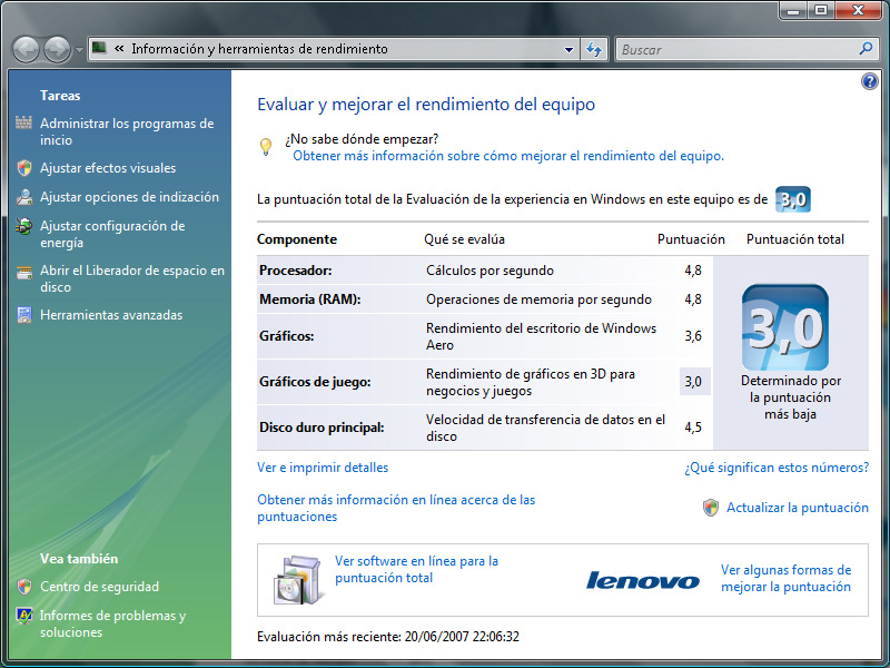 Windows Vista da su resultado general con respecto a la mínima puntuación del sistema. Lo cierto es que la 7300 de Nvidia es el punto más flaco de este ordenador, bien podría habérsela ahorrado Lenovo y usar la integrada de Intel, pero el resto de puntuaciones son muy equilibradas superando el 4.5 tanto en procesador, como en memoria y disco duro.